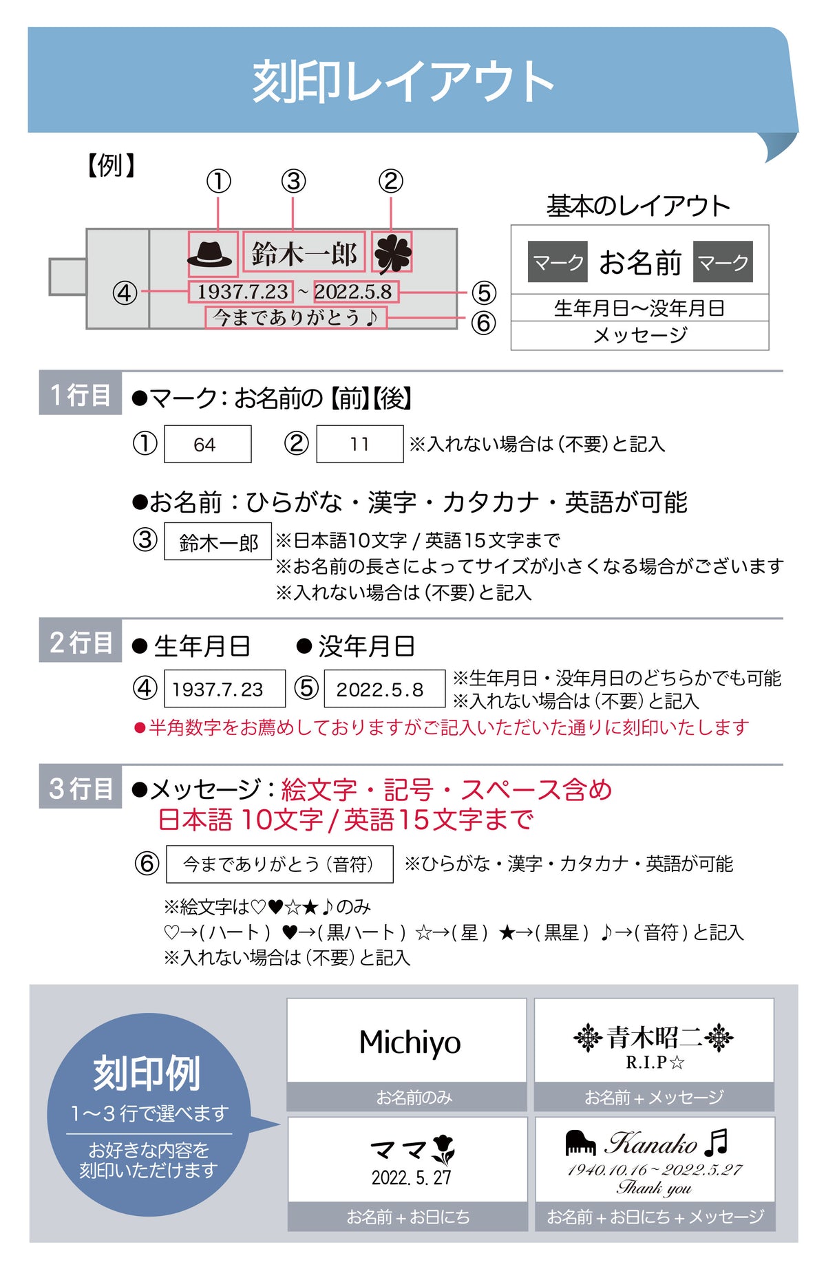 ※記載なしの場合は不要と記入 ※絵文字を入れたい場合は(ハート)(黒ハート)(星)(黒星)(音符)と記入してください