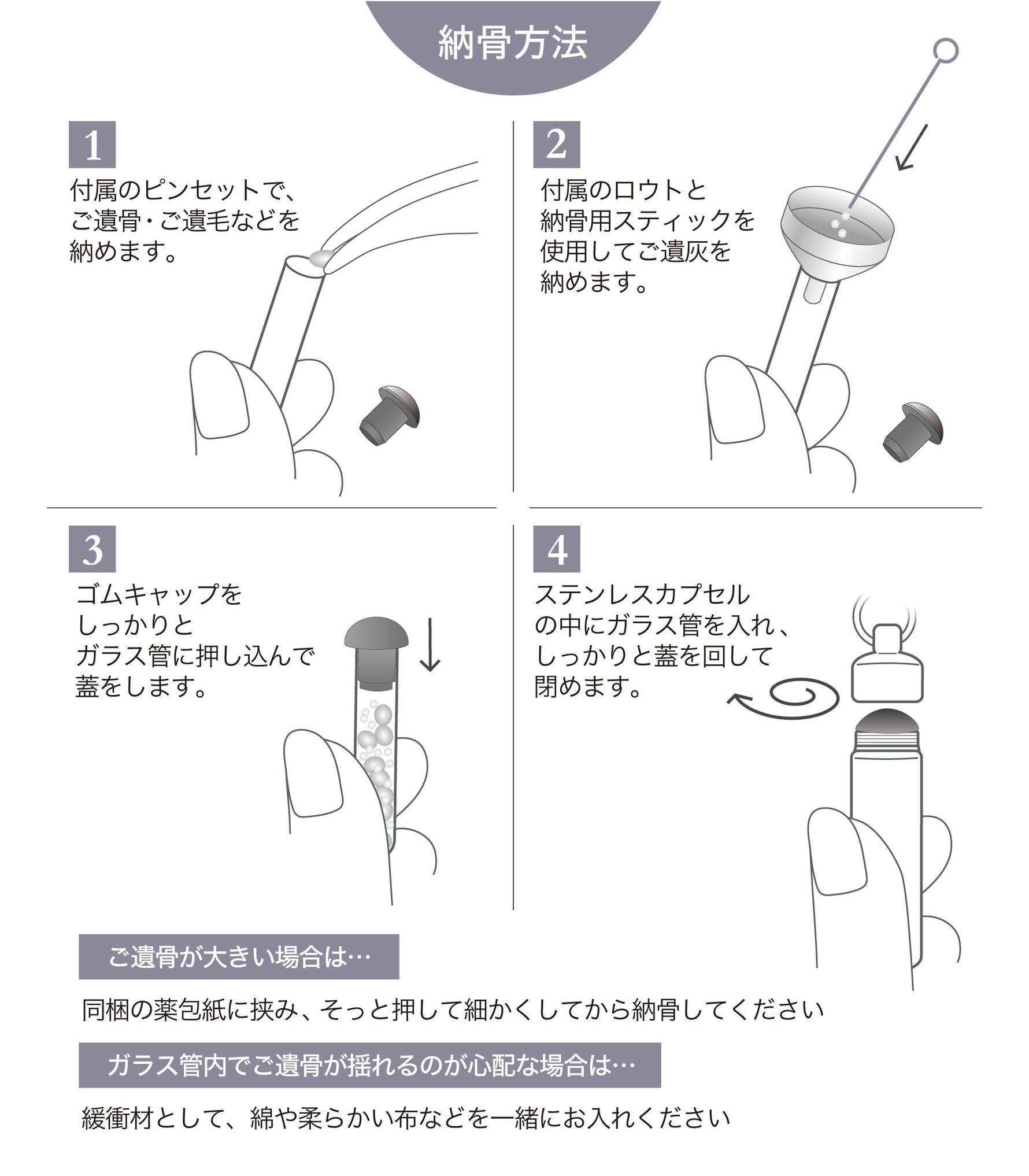 ご使用方法 カプセル内側のガラス管に、 遺骨・思い出の品などを納めます。