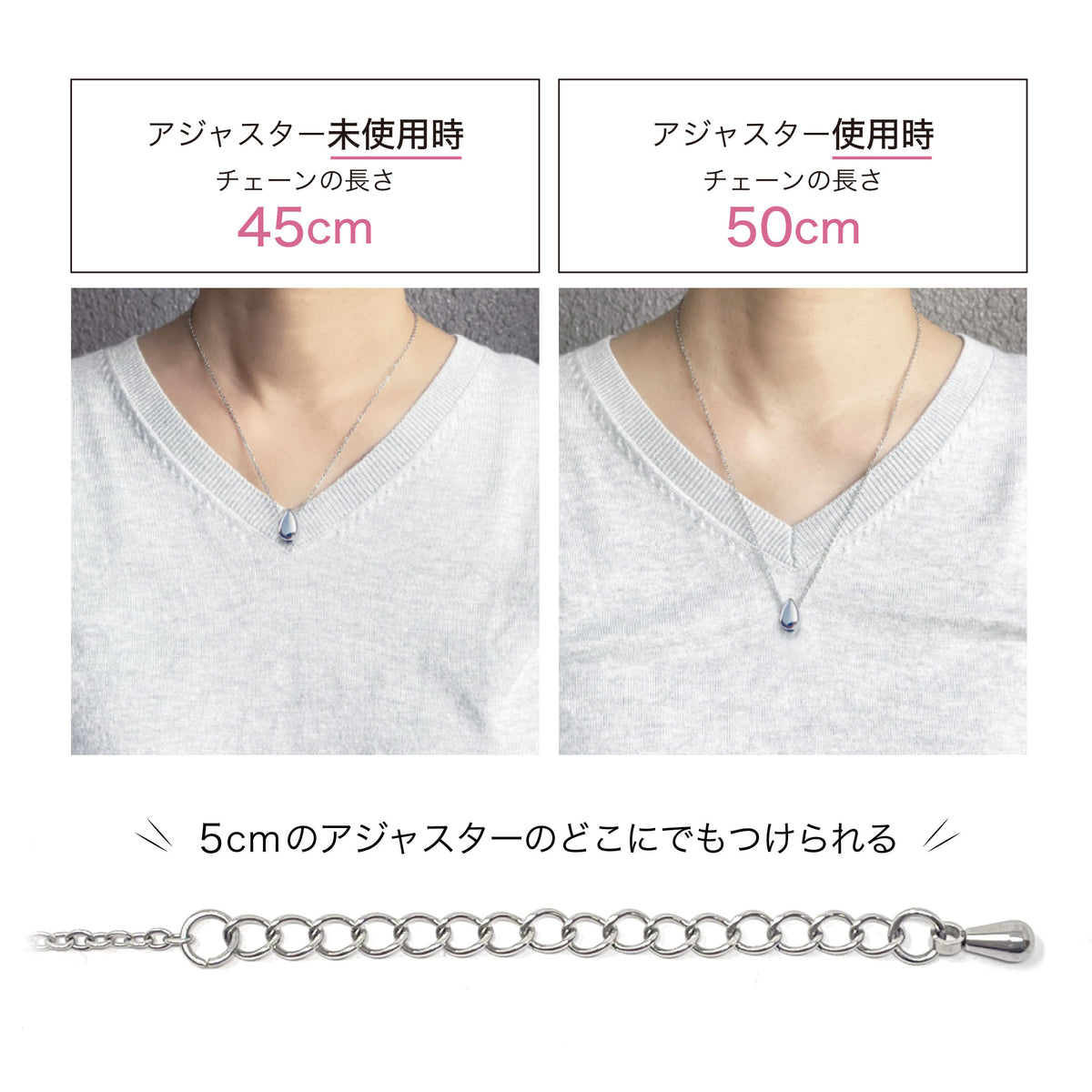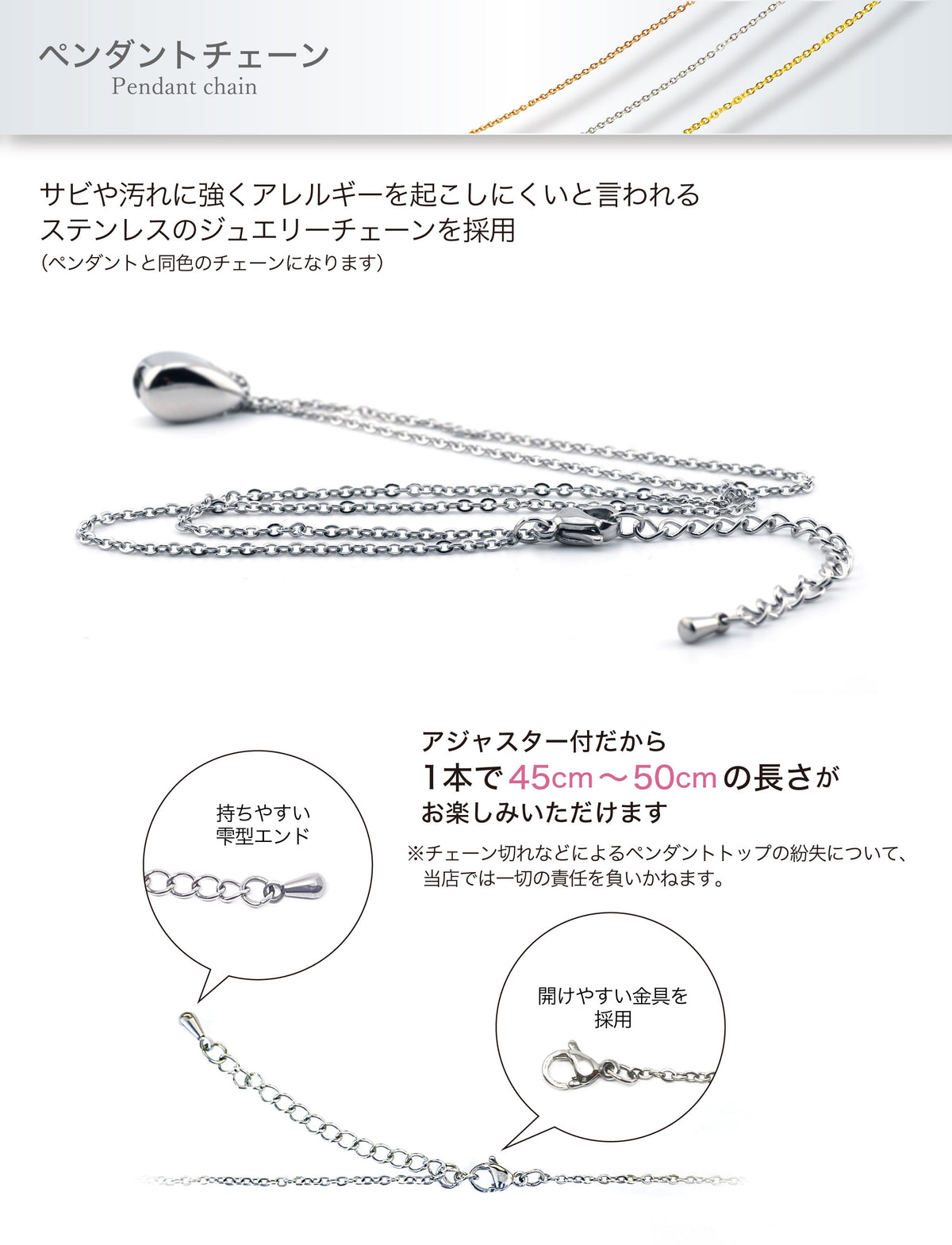 ■サビや汚れに強く、アレルギーを起こしにくいと言われるステンレスのジュエリーチェーンを採用