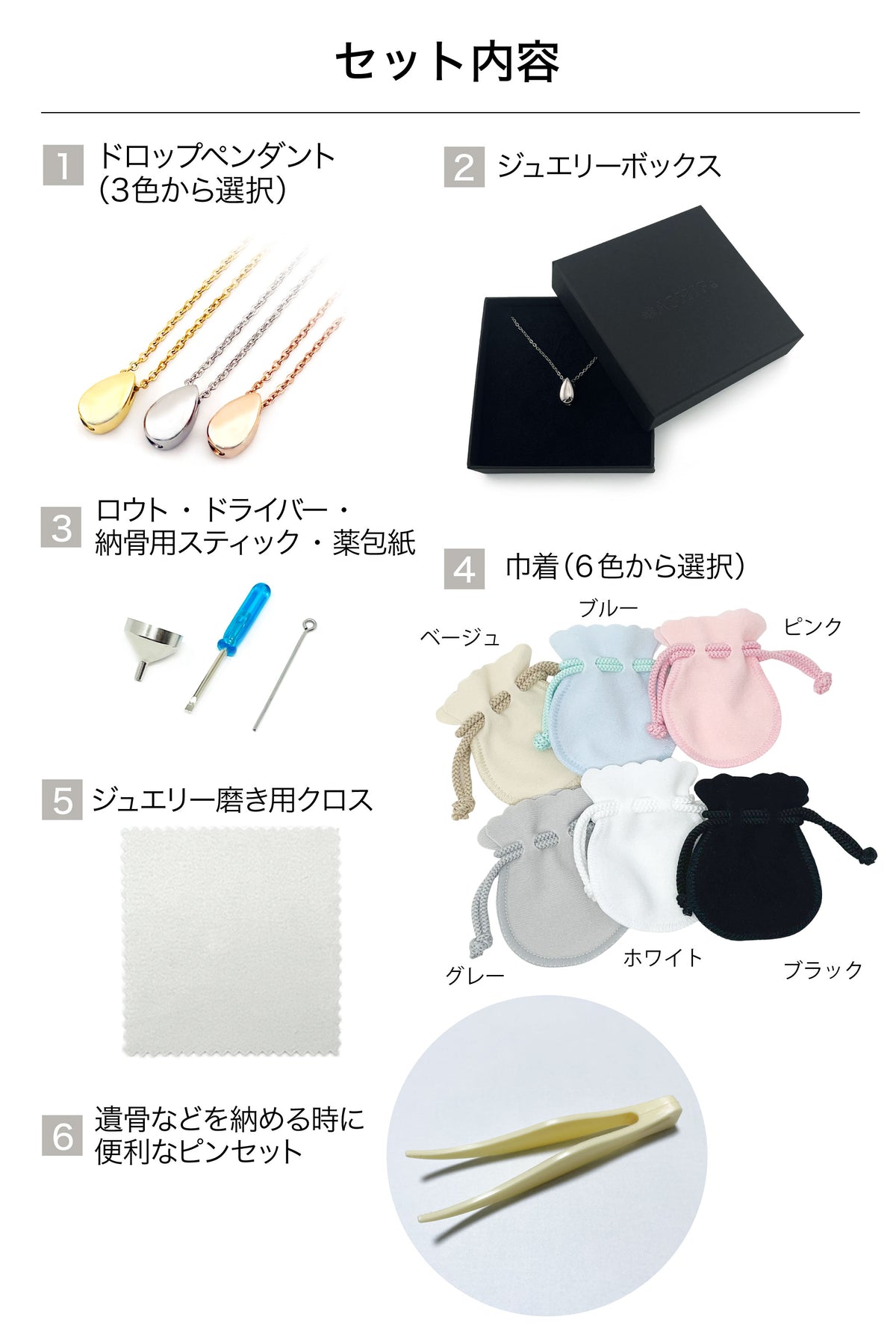 | 注意事項 | ・当商品は完全密封・完全防水ではございませんので、入浴やプール時のご使用はお控えください。 ・いかなる場合であっても、ご遺骨・体の一部の紛失については、当社では一切の責任を負いかねます。 |