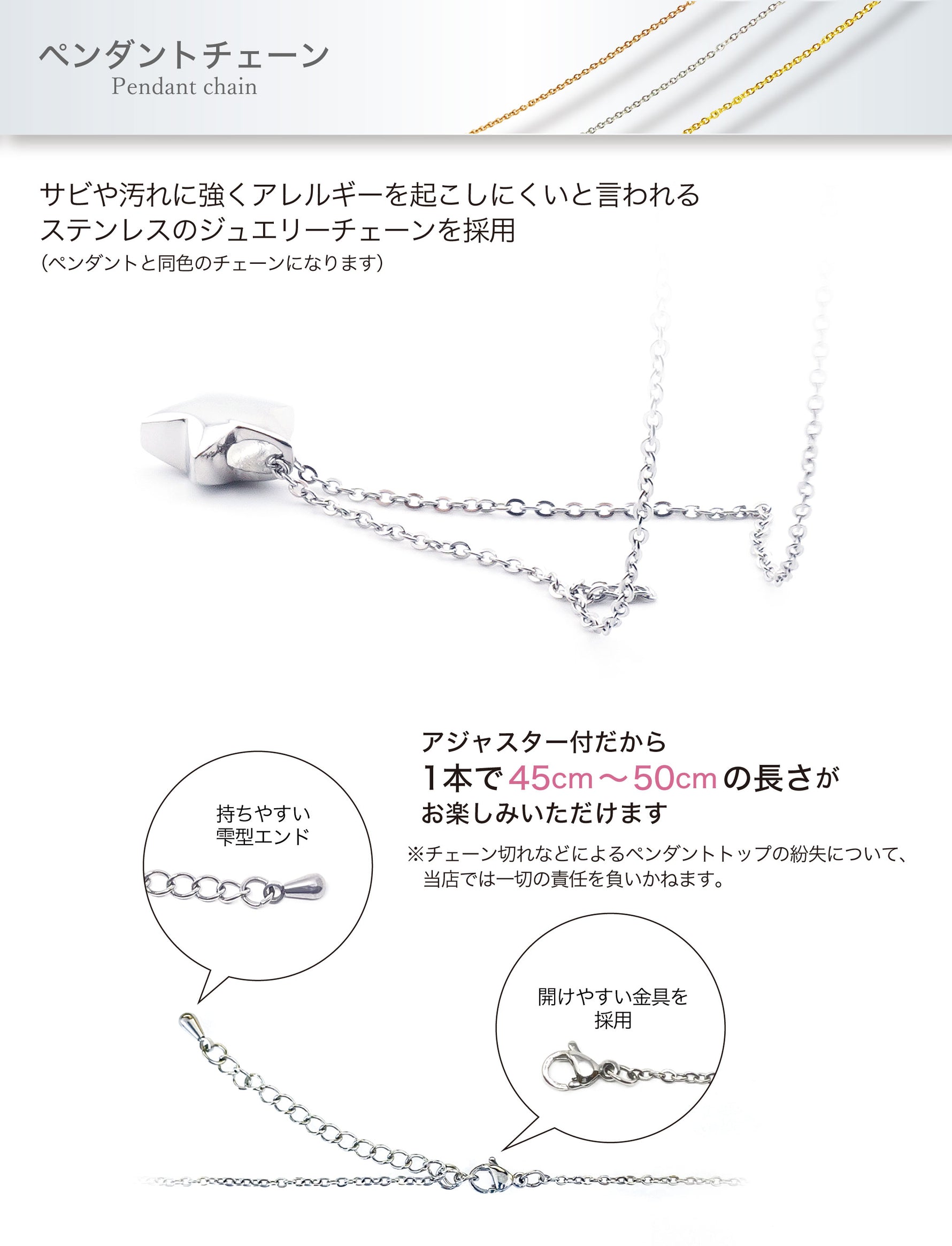 [ペンダントトップ]ステンレス:W 14.2mm D 14.2mm H 6.4mm [チェーン]ステンレス・メッキ 45cm~50cm(アジャスター付) |