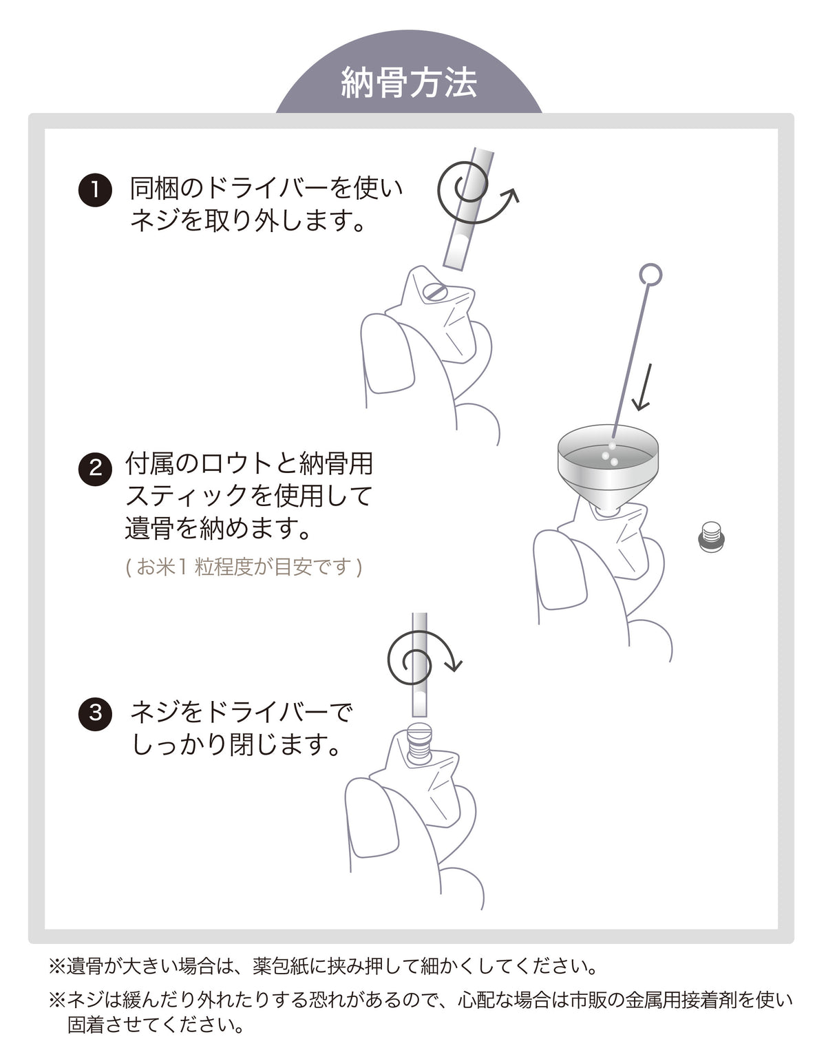 | ご使用方法 | ペンダントの本体部分に遺骨を納めます。 |