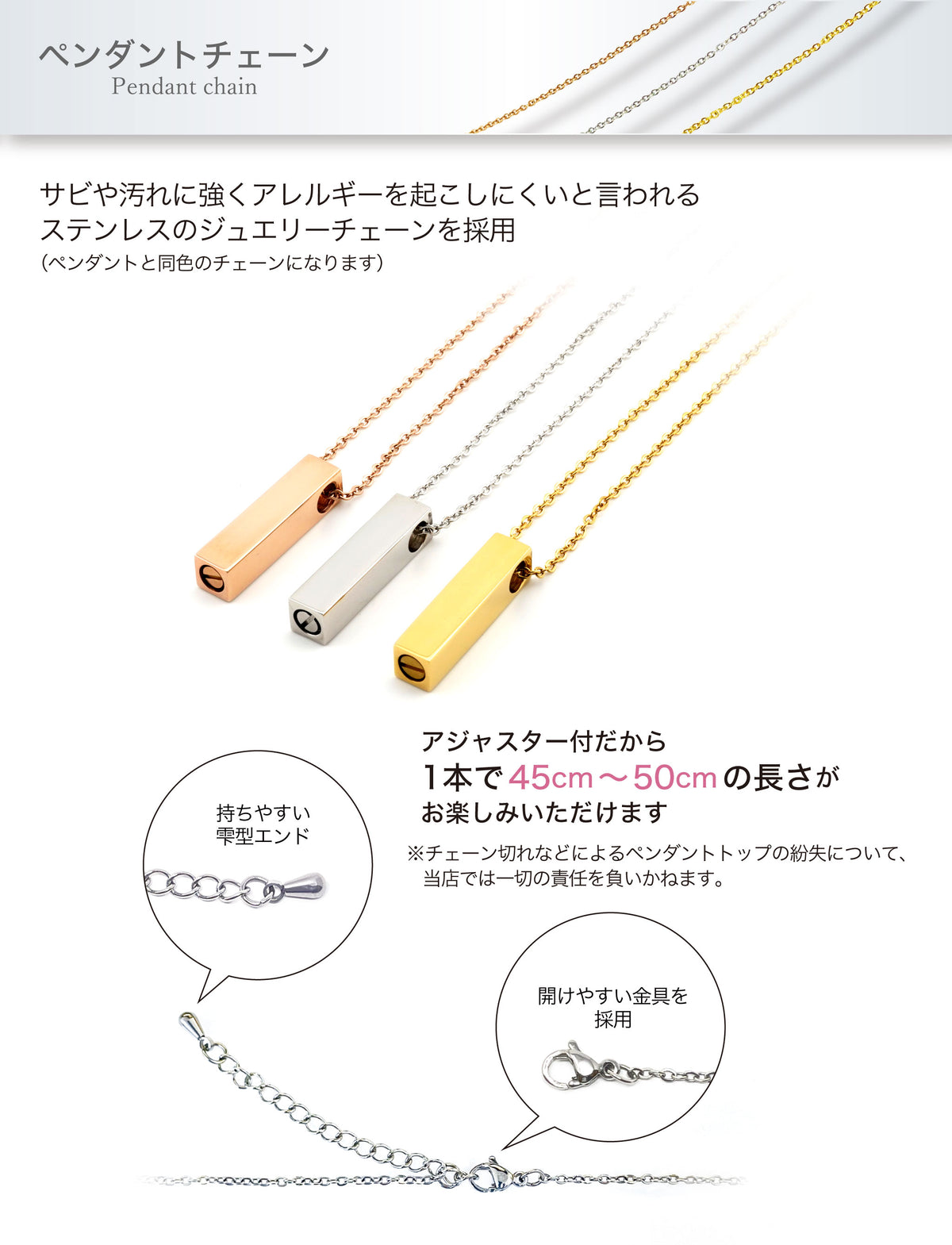 ■サビや汚れに強く、アレルギーを起こしにくいと言われるステンレスのジュエリーチェーンを採用