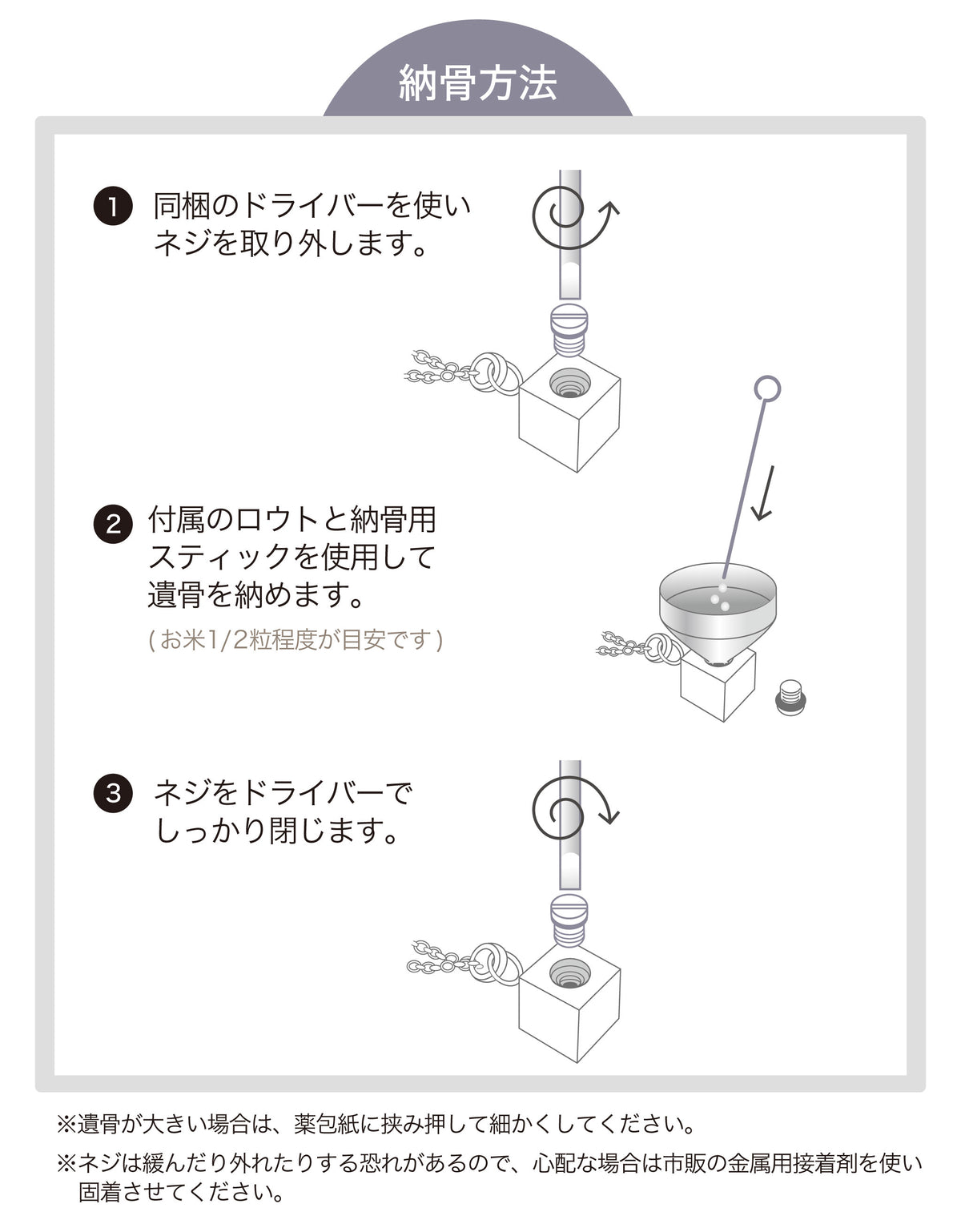 ■すぐにお骨などを納めることができる薬包紙&漏斗&ドライバーセット&ピンセット付