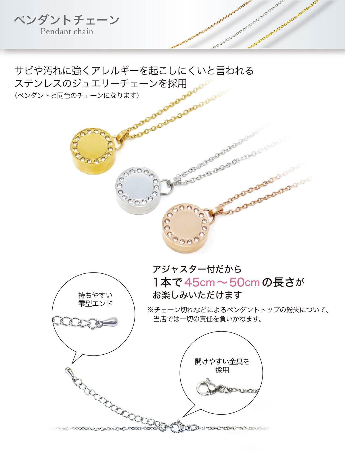 ■サビや汚れに強く、アレルギーを起こしにくいと言われるステンレスのジュエリーチェーンを採用
