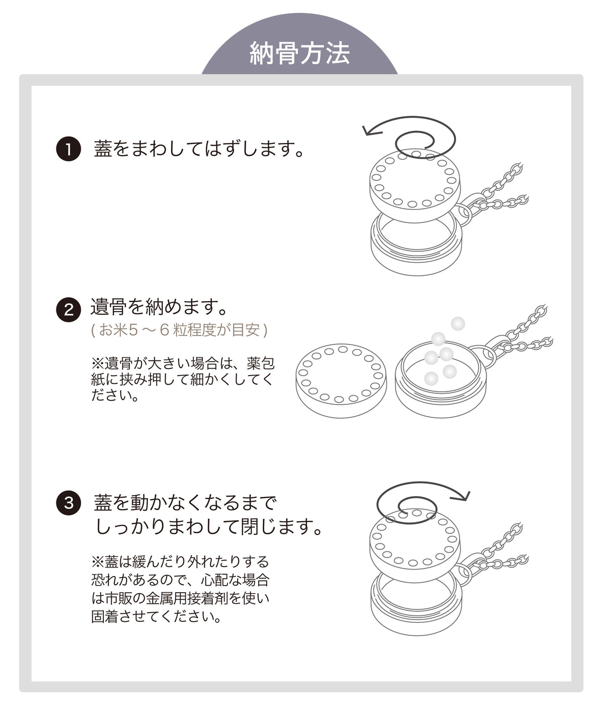 | ご使用方法 | カプセル内側のガラス管に、 遺骨・思い出の品などを納めます。 |