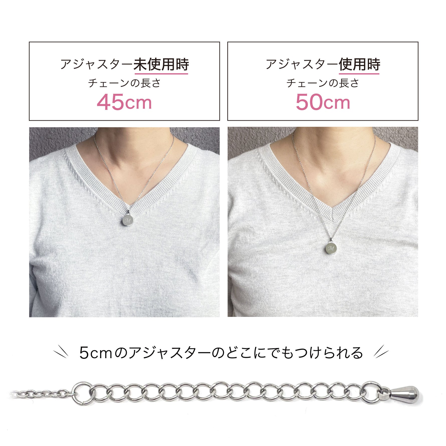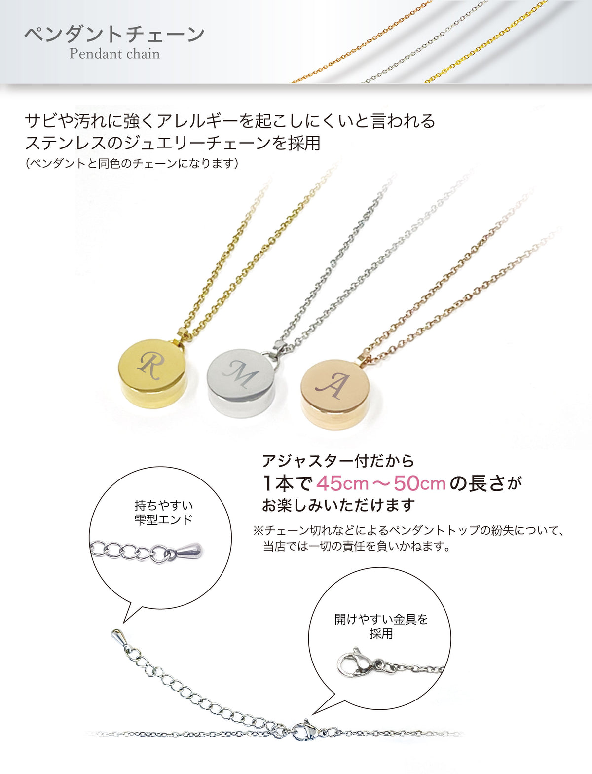 ■サビや汚れに強く、アレルギーを起こしにくいと言われるステンレスのジュエリーチェーンを採用