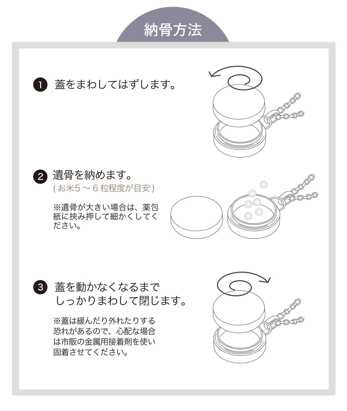 | ご使用方法 | ペンダントの本体部分に遺骨を納めます。 |