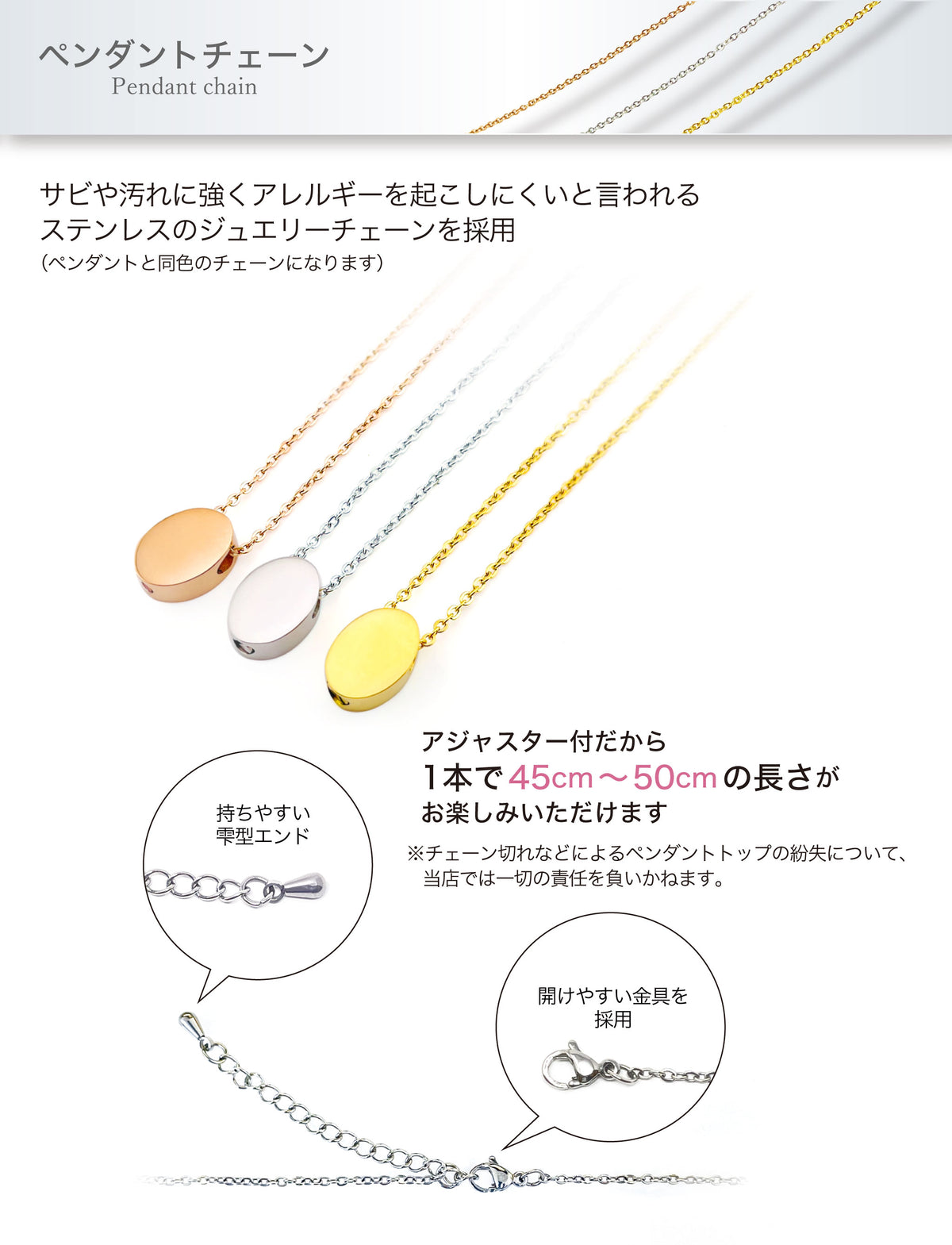 ■サビや汚れに強く、アレルギーを起こしにくいと言われるステンレスのジュエリーチェーンを採用